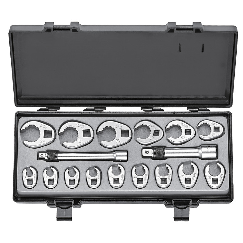 5172 Force 17 Piece Metric Crows Foot Spanner SetThese 17 Piece Crows Foot Metric Spanner Sets are a truly trade quality kit for the serious mechanic. Constructed from strong chrome vanadium steel & featuring a 12 point socket design allowing for easy access where ordinary spanners & sockets can’t reach.