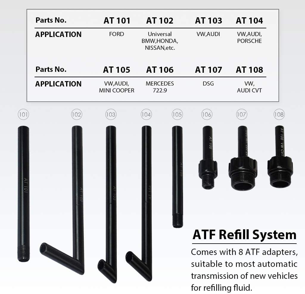 Enclosed adaptors::Adaptor for Ford, 1/8″ 27NPTUniversal Adaptor for BMW, Honda, Nissan etc.Adaptor for VW, AudiAdaptor for VW, Audi, PorscheAdaptor for VW, Audi, Mini, M10 x 1.0Adaptor for VW & Audi DSG, M24 x 1.5Adaptor for VW & Audi CVT, M22 x 1.5Adaptor for Mercedes 722,9, M12 x 1.5
