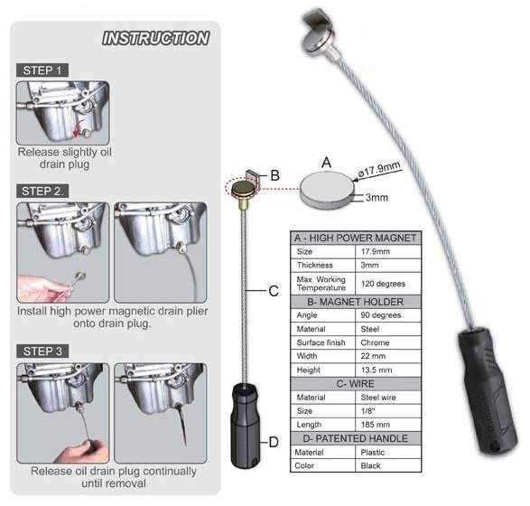 Drain oil and hot engine oil, transmission fluid, gear oil without dangerHigh power magnet grips oil plug wellPleasant oil changing worksPatented handle provide comfortable grippingUniversal application